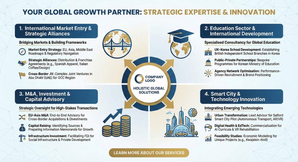 Many firms provide market entry reports that look excellent on paper but falter during implementation. We specialise in tangible outcomes. Whether it is negotiating directly with the Korean Ministry of Education or structuring complex JVs in Abu Dhabi, we bridge the gap between high-level strategy and operational reality.